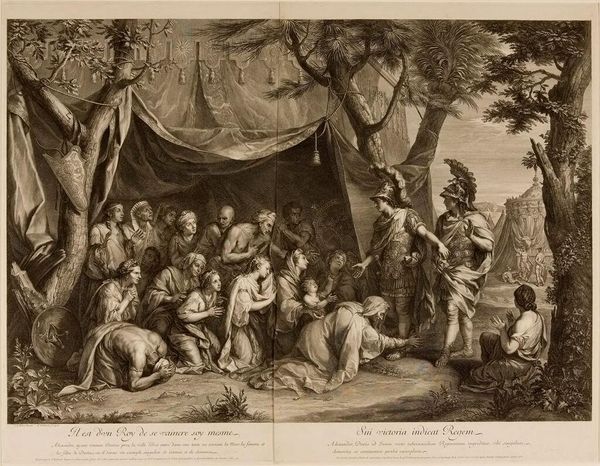 Curator: Bernard Picart created this engraving, "The Marriages of Tobie," sometime between 1673 and 1733. It's quite a detailed scene for such fine lines. Editor: It feels…theatrical. Like a stage set, with the angel pulling the reluctant groom towards the wedding feast. Is he hesitant? Curator: Well, the story of Tobie involves divine intervention and healing, so perhaps the "reluctance" is more about awe than hesitation. Notice how the artist uses light and shadow to guide our eyes. Editor: Still, I’m drawn to the angel. That determined stride and the way he’s practically dragging Tobie along. It almost feels like a comedy routine. Curator: The piece does offer a lighter take on religious narrative, fitting into a broader trend of humanizing biblical stories. Editor: Humanizing, yes, but with a wink. It’s in the details, isn’t it? The slightly overdramatic gestures and the faces of the wedding guests… Curator: Indeed, Picart was skilled at capturing those nuances of human interaction, grounding the divine in the everyday. Editor: A divine comedy, then. Perhaps that's why it still resonates after all these years.