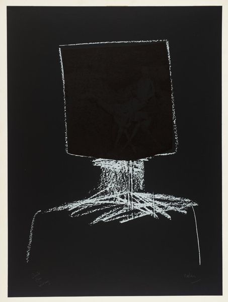 Curator: This compelling image is titled "Kelly" by the Australian artist Sir Sidney Nolan. Editor: It’s stark, isn’t it? Visually striking. The contrast creates an immediate sense of foreboding. Curator: Nolan’s work often engaged with Australian history and mythology, reflecting the social narratives that shaped the nation's identity. Editor: Indeed. And the bushranger Ned Kelly, with his iconic helmet, becomes a symbol of resistance against authority but also, perhaps, a symbol of oppression. Curator: Exactly. Nolan’s Kelly series, for example, explores themes of rebellion, justice, and the complexities of national identity in post-colonial Australia. Editor: Considering the period and the artist's background, the image feels like an interrogation of heroism, asking us to consider who gets remembered, and why. Curator: Absolutely. It’s fascinating to observe how Nolan uses this stark imagery to challenge established historical narratives. Editor: A powerful reminder that art serves as a mirror and a challenge to our understanding of history and its ongoing impact.