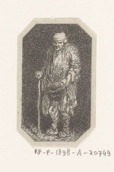 Editor: This is Adrian Ludwig Richter's "Beggar with the Rosary, after Callot." The line work is so detailed. What statements were Richter and Callot trying to make about society? Curator: It's intriguing how Richter reinterprets Callot's image. Callot often depicted the margins of society, offering a window into everyday life. Richter, working later, perhaps uses this imagery to reflect on historical memory and the changing perceptions of poverty. What do you think the act of copying adds to the social commentary? Editor: Maybe Richter is commenting on the cyclical nature of poverty and how these social issues persist through time? Curator: Precisely. By referencing Callot, Richter engages in a dialogue across time, prompting viewers to consider the enduring relevance of these themes and the role of art in shaping our understanding of them. Editor: So, the act of copying transforms the artwork itself into a commentary. Very interesting!