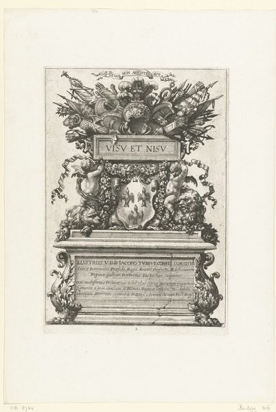 This is "Trophée Médallique sincere et de chancement d'habitation," an undated print by Jean Lepautre. Notice the intricate and symmetrical arrangement. The composition is structured around a central inscription, flanked by classical figures and medallions, all framed by ornate borders. The dense lines create a rich, textural surface. The work invites us to delve into the semiotic interplay between text and image. The medallions, featuring scenes of heroism and virtue, serve as visual metaphors, reinforcing the written dedications. The classical figures on either side act as supporting allegories. They embody ideals that resonate within the cultural milieu of Lepautre's time. Consider the use of framing. It is not merely decorative; it encapsulates and directs our interpretation of the print's meaning. It presents an allegory of power and patronage, inviting us to interpret its visual components through cultural and philosophical lenses.