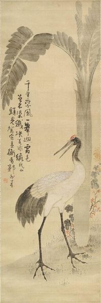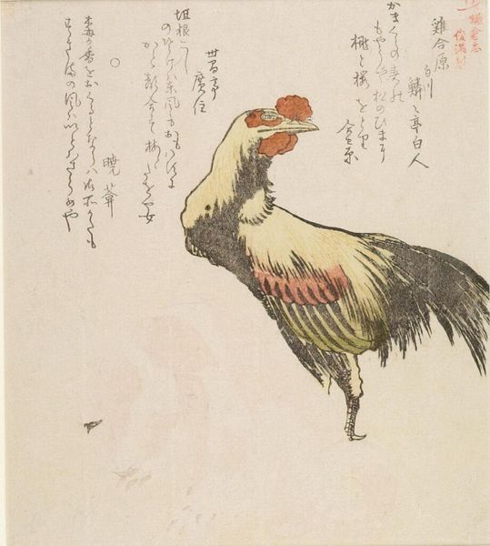 Curator: Hokusai's "Goose" at the Harvard Art Museums, while undated, presents a compelling visual study of this bird. My initial impression? It's got this quiet, almost meditative quality. Editor: Indeed. Geese, across cultures, often symbolize vigilance, community, and safe return. Look at the way Hokusai renders the feathers – each stroke seems to capture both texture and movement. Curator: And the inclusion of the poem? It elevates the image, suggesting a connection between the natural world and human reflection. The goose becomes more than just a bird; it's a symbol, a messenger. Editor: It's interesting how the stark simplicity invites contemplation. It's not just seeing a goose, it's feeling a moment of stillness with it. The artist captured more than he knew, I suspect! Curator: Absolutely. Hokusai's goose serves as a wonderful reminder of the symbolic power of simple imagery, something that speaks across time and cultures. Editor: Yes, it’s the kind of image that sticks with you, offering new little nuggets of insight with each viewing. A simple bird, but profound nonetheless.