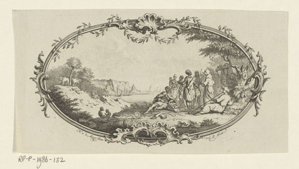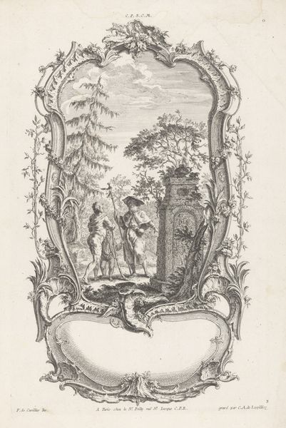 Curator: Ah, I’m immediately drawn to the delicate festivity of this scene. There’s something almost dreamlike about the figure enclosed within that floral border. Editor: Indeed. We’re looking at "Man with Carafe and Glass," an etching and engraving by Bernard Picart, dating sometime between 1683 and 1733. It’s currently held in the Rijksmuseum collection. The Rococo style is clearly evident, especially in that elaborate frame. Curator: That Rococo frame almost feels protective, doesn't it? And look at the man himself, raising his glass and what seems to be a decanter—a gesture of joyful abandon! The glass seems to denote themes of social gatherings and, perhaps, the implied excesses thereof. Editor: I see that festive exuberance reflected in the cultural context. This piece would have likely been produced and consumed within circles that celebrated leisurely pursuits. The placement within the decorative border feels indicative of an ornamental object, designed for a specific elite social setting. Curator: It certainly speaks of privilege. His flamboyant dress is itself a marker of social standing. Though what is the narrative implied in the work? What could be symbolized through the prominent imagery of glass? It does feel like the exuberance suggested might be of temporary effect. Editor: The era’s social rituals certainly inform its purpose. Picart may have intended this print as an emblem of societal sophistication, reflecting its fascination with pleasures but equally hinting at the transience of wealth. It really mirrors a period deeply absorbed with projecting a certain cultivated image. Curator: The very ephemerality of the etching, too, contrasts with its carefully constructed image, echoing your idea about wealth’s fleeting existence and pleasures as temporary escapes from everyday concerns. Editor: And in its afterlife as a museum piece, it stands as a silent but potent commentary on the tastes and concerns of a bygone society—a frozen moment that reflects persistent questions about the role and representation of pleasure. Curator: Yes, leaving us to contemplate, still, our relationship to celebration. It is more than meets the eye. Editor: Exactly. In studying historical artworks, we continue deciphering visual cues, adding nuances that transform our understanding.