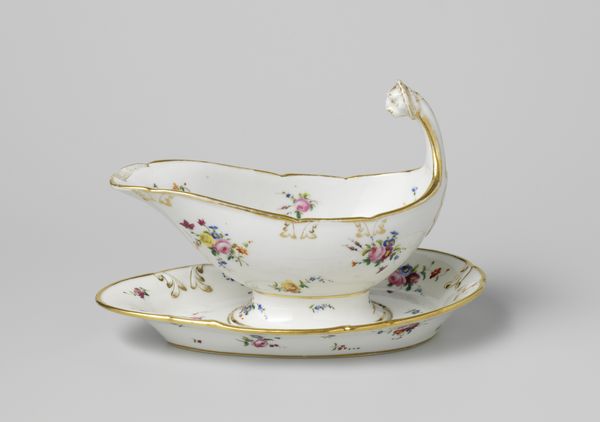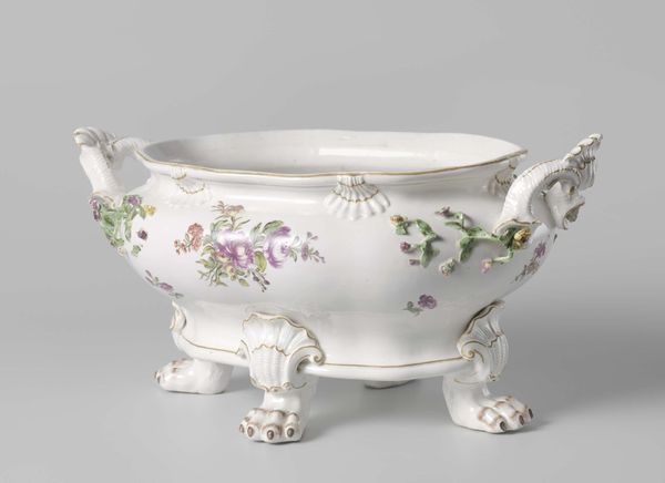 Editor: This is a porcelain tea and coffee set, titled "Coffee and tea service with birds in a landscape," made around 1765. What strikes me most is the whimsical quality. It seems so light, like something from a fairytale! What do you make of it? Curator: Fairytale, eh? I like that. To me, it whispers of courtly elegance, those lavish tea parties held in grand European salons. Imagine the clinking of cups, hushed conversations, powdered wigs, maybe a revolution brewing beneath the surface. It’s Rococo, of course - all delicate curves and playful details, birds and blossoms intertwining across the porcelain. See how the artists use soft pastel colors. Can you picture what type of person enjoyed drinking from these pieces? Editor: Someone very wealthy, definitely! With excellent taste. The detailed artwork must have taken an age to complete, but the craftsmanship is beautiful. Is there a certain historical significance to these bird motifs? Curator: Birds in art are tricky—they could represent freedom, delicate beauty, a simple appreciation of nature. These pieces were created in Ansbach which has an impressive tradition of faience, maiolica, and porcelain production since the early 18th century, even though Ansbach's porcelain production was short lived. The style is heavily influenced by Sèvres. Wouldn't you love to sit here having tea together from this exact service, editor? Editor: Absolutely! Though maybe without the powdered wigs. This makes me really think differently about decorative art now, how even something so functional can be a portal to another time, or express deep feelings. Curator: Exactly. Objects like these become vessels, carrying stories through centuries, holding echoes of laughter, gossip, and dreams. They still manage to charm after all this time, don't they?