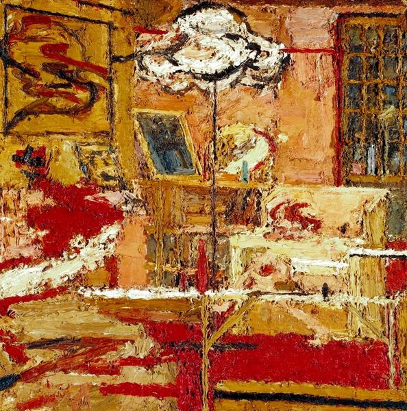 Editor: Here we have Leon Kossoff's large-scale oil on canvas, "Woman Ill in Bed, Surrounded by Family." The impasto is so thick; it almost feels sculptural. What do you make of the composition? Curator: The density of the paint is indeed remarkable. Note how the artist uses the materiality of the medium to create a sense of claustrophobia. The palette, dominated by browns and greys, further emphasizes the somber mood. How do you think the structural arrangement contributes to the overall effect? Editor: I see what you mean. The figures seem trapped within the space, maybe reflecting the illness and its impact. Thanks, that's a new way of seeing it for me. Curator: Indeed, by analyzing the formal elements, we gain insight into how Kossoff communicates complex emotional states.