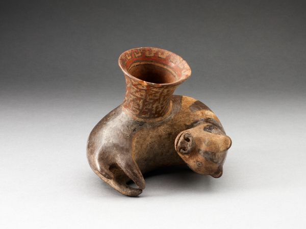 Curator: This cast metal piece, dating from around 1900, is known as the "-Oriental- still bank." Its anonymous maker fashioned it as both a decorative object and a functional item, intended to hold coins. Editor: It's deceptively charming at first glance, but there's an undeniable tension there. The weathered metal and simplified forms have an almost haunting quality, a stark contrast to what I assume was supposed to be playful. Curator: The iconography here is fascinating. The camel, of course, has long symbolized the "Orient" in Western eyes, embodying notions of trade, exoticism, and even subservience. Here it appears with a calf—an additional layer of gentle domestication and also alludes to ideas about wealth, as they were essential in the trading culture and wealth. Editor: That so-called "Orient" being entirely imagined, of course. That period's fascination became a form of cultural appropriation and outright domination. It is important to remember these banks weren't about cross-cultural exchange; they were a means of accumulating wealth, fueled, often, by the very exploitation of the regions the camel evokes. Curator: Yes, and this representation of exotic lands as something to be possessed – miniaturized, secured within one's home – reveals much about the Western mindset. I am reminded of decorative styles where everything Oriental has a kind of luxurious allure but also carries ideas about power imbalances. The camel being placed on a rocking platform emphasizes its commodified form of decoration to serve the home. Editor: Absolutely. It’s hard to divorce its decorative-art appeal from its troubling context. That term "Oriental" plastered on the rocker— it’s a label imposed from the outside, flattening complex realities into a single, marketable brand that is only good for decorating houses, completely dismissing their origins. I would analyze this using postcolonial approaches of inquiry to fully grasp the historic and societal perspectives of appropriation during the early twentieth century. Curator: The patina, worn away from use, whispers about the countless coins that passed through this object—each one reinforcing those established power structures and ideas. The damage to the metal, the visible signs of time and the aesthetic qualities of aging. Editor: Looking at it now, I have such a mixture of sadness, rage and disillusionment, really, with how the "allure" or the attraction can mask deeper, more unsettling dynamics of social history and global capitalism. I find myself searching for a way to return dignity and truthfulness to cultural artistic expression in this "post" era.