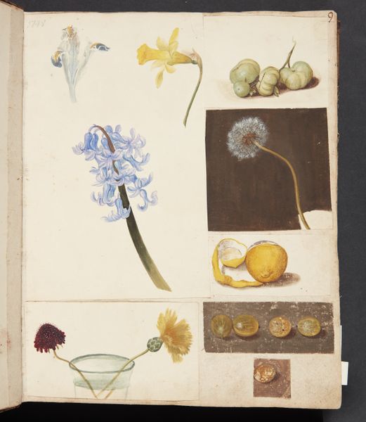 Editor: So, here we have Johanna Fosie’s "Study of a Flower in a Glass with Water and White Asparagus," created sometime between 1748 and 1759. It's rendered with colored pencil, gouache, and watercolor. It has this lovely, delicate feel… What symbolism or deeper meaning do you find in this image? Curator: It’s tempting to see the flower, bravely presented in a glass, as a symbol of transient beauty, right? Especially set against the fading asparagus. But consider the cultural context: flower painting in this period, particularly by women artists, often spoke to a quiet but powerful negotiation of status and knowledge. Editor: Status and knowledge? How so? Curator: The image may have operated as more than a pretty thing; through its intricate depiction, a whole history of the world is being displayed as if claiming some authority through observation. Why those specific flowers, in that specific vessel? Where did it come from, what does it represent? And why pair with asparagus? This juxtaposition evokes the cyclical, ephemeral qualities of both. Asparagus tips are a spring delicacy, quickly gone and thus precious; their depiction prompts reflection on nature's cycles of bounty and the fleeting moments we should savor. Editor: So, it's less about just the beauty of the flower and more about…understanding it, categorizing it, possessing a certain type of intellectual power. It changes how I see it entirely. Curator: Precisely! It’s about claiming authority over knowledge of the natural world. Every careful brushstroke embodies a larger conversation around botany, scientific accuracy, and feminine intellectual spaces. The drawing carries these symbols while questioning them. Editor: I see it now - thanks to your perspective I can feel how loaded this innocuous-looking still-life really is! Curator: Absolutely; hopefully now our listeners do as well!