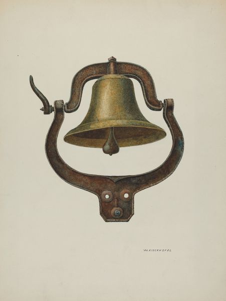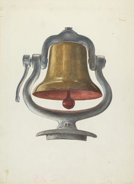 Editor: This is "Bell (From a Locomotive)," made around 1937 by Harry Mann Waddell using watercolor and charcoal. It’s quite detailed and looks almost… utilitarian. What can you tell me about it? Curator: It's interesting to see a mundane, functional object depicted with such care. We should think about the context: 1937, the tail end of the Depression. The locomotive, a symbol of industrial progress, but also a marker of working-class labor. The artist elevates the everyday through close observation. Editor: So, it’s less about the beauty of the bell and more about the labor it represents? Curator: Precisely. The materiality matters. Think about the process: metal forged, shaped, used, and then represented in charcoal and watercolor. These mediums soften the industrial harshness. Was the artist a worker himself? Or someone observing and reflecting on that labor? Editor: I didn’t consider the choice of materials as a conscious decision commenting on labor. Curator: Consider also that realism in art serves a specific purpose in this period. What did it mean to meticulously render an object like this when abstraction was taking hold? Editor: It does seem like a deliberate choice, perhaps to highlight the importance of tangible, working-class objects and labor during that time. The skill of representing metal and light on a simple object is really beautiful! I'm glad you made me think of how the materials and the time period were really chosen purposefully. Curator: It all points towards the social and economic fabric of the era and highlights how something utilitarian could actually be beautiful.