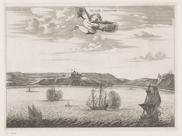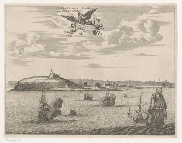 This line drawing, 'Gezicht op de Allerheiligenbaai', captures a panoramic view, using line and form to build a landscape in miniature. The anonymous artist's technique leads the eye across the bay with ships at sea and buildings on the horizon. Consider how the composition divides the image into distinct zones: the detailed foreground with ships, the middle ground with the settlement, and the upper area filled with clouds. This structure allows a detailed depiction of depth. The artist utilizes hatching and cross-hatching to suggest texture and tone, and to create a sense of volume and presence. This is apparent in the billowing smoke and rippling water. The balance between detail and abstraction creates a semiotic system of signs that invite the viewer to decode the image. The artist offers not just a view, but an interpretation that speaks to the intersection of representation and power. The drawing acts as a detailed document and a symbolic construction of place and purpose.
