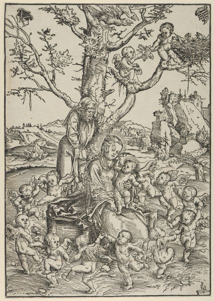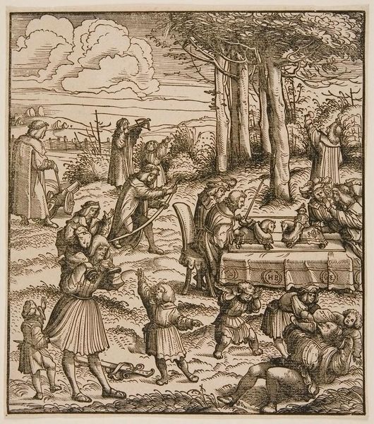 Editor: So, this is "The White King as Child Playing with Other Children," a woodcut by Hans Burgkmair, created sometime between 1775 and 1800. It has a chaotic yet playful energy to it, with many figures packed into a single scene. How do you interpret all this activity? Curator: The sheer density of figures itself is significant. Notice how each interaction, each glance, contributes to a narrative. It is far from chaotic; rather, the image operates almost like a memory palace, layering symbols and stories related to childhood, rulership, and destiny. Editor: Memory palace? That’s interesting! Could you elaborate? Curator: Certainly. Consider the “White King” himself. Children mimic adult behavior. Play becomes rehearsal, subconsciously absorbing social hierarchies and cultural values. The games foreshadow the weighty responsibilities of kingship, so this playing becomes fraught with symbolism and loaded with inherited meaning. Don’t you think? Editor: I see your point! So, even the seemingly innocent acts are infused with cultural weight. Are there other visual clues that point to this? Curator: The choice of games and the presence of certain adults suggest more than simple recreation. The presence of older figures in the background signals instruction. Also consider the costumes - are these just regular clothes or something more elaborate? The artist encodes a sense of formalized ritual. Burgkmair is very careful in selecting imagery that reveals cultural memory and continuity through visual symbols. Editor: It's fascinating how you've revealed so much beneath the surface. I had initially overlooked those subtler, yet critical details. Curator: The image actively solicits interpretation, it offers not just an image of children at play but provokes analysis of the socialisation of future leaders. Every detail carefully considered to create continuity through powerful visuals. Editor: Thank you! I’ll definitely approach similar works with much more curiosity in the future!