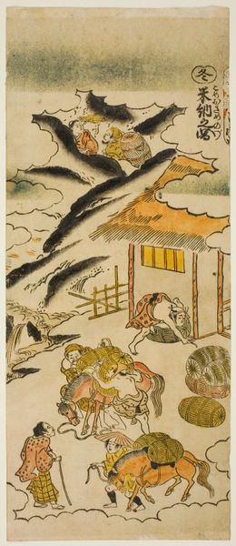 Editor: This woodblock print, "Evening Bell at Miidera Temple," made around 1730 by Nishimura Shigenaga, feels surprisingly dynamic. I’m drawn to the figures and how they seem to be caught in a specific moment in time within this landscape. What strikes you most about this piece? Curator: Well, considering its production as a commercially available print, let's look at the labour involved in producing such a piece. The initial drawing by Shigenaga, the carving of the woodblocks – requiring highly skilled artisans, each potentially specializing in key blocks versus color blocks - and then the printing process itself. How many impressions could these blocks withstand before needing replacement? Editor: That’s interesting. So, even the apparent simplicity relies on layers of skill and production decisions. What does the process tell us about the art form? Curator: The *ukiyo-e* tradition arose from a specific cultural and economic moment. The *chonin*, the merchant class, had disposable income and sought leisure and entertainment. Woodblock prints became a relatively affordable commodity. Think about it - mass production altered access. This artwork becomes both aesthetic object and document of socio-economic structures, don't you think? It speaks to both individual craftsmanship and industrial potential. And consider how this piece, even depicting the spiritual Miidera Temple, circulated and was consumed within the burgeoning pleasure districts. What’s the relationship between high and low culture on display here? Editor: I see. It challenges the idea of art existing outside the everyday lives and economies of the people who made and purchased it. Curator: Exactly! Examining its materials and distribution unveils a layered narrative about labor, access, and the fluidity of cultural value in 18th-century Japan. Editor: I’ll definitely consider the material context and labour involved in creating art moving forward!