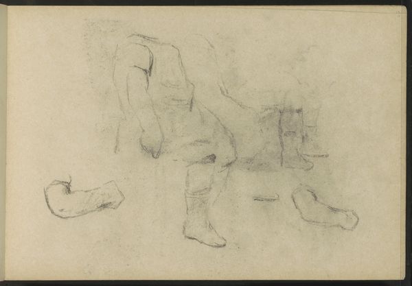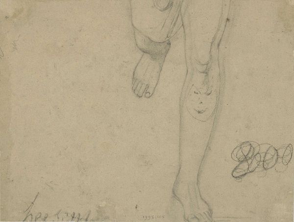 Curator: What a subtle yet compelling drawing! We’re looking at "Studies of Feet [verso]," a pencil drawing on paper completed around 1855 by Edgar Degas. Editor: Subtlety is right. The stark contrast of the delicate pencil lines against the blank paper lends a rather ghostly presence to these feet. A liminal quality, wouldn't you agree? Curator: Absolutely. These studies are part of Degas’s broader exploration of the human form. It's interesting to think about his focus, particularly given his later depictions of ballet dancers. We might consider how the foot, often overlooked, carries so much significance. The drawing asks: How can we rethink the place, function and even burden of this foundational body part? Editor: Precisely. See how the formal execution emphasizes pure shape? Notice the attention to the bone structure, the articulation of tendons, the soft padding of the heel. Degas reduces the human foot to an abstract study of volume and texture, demanding we appreciate its aesthetic merit separate from its role. Curator: He does challenge our typical perspective! It’s impossible to ignore that feet, especially bare feet, have complex associations with labour, poverty, and even shame. Degas, knowingly or unknowingly, intersects with those narratives by forcing a new level of intimacy between the viewer and the most commonly disregarded area of the human form. Editor: Perhaps. Still, Degas presents these feet without contextual grounding, detaching them from their sociopolitical narratives and encouraging purely formal engagement. Think about his composition; he intentionally gives each foot equal emphasis within the visual hierarchy, balancing their tonal values. This gives them equivalence and highlights the interplay of forms, lines, and shadows in his mark-making. Curator: It seems even the artist himself might not be fully decided. We see both an engagement with, and detachment from, the body's inherent positionality in society. Regardless of whether those bare feet evoke connotations of oppression or just an artistic study, they make us wonder. Editor: Exactly. And now I see that Degas is much more playful and exploratory than he is committed to communicating some political or emotional message through his artwork.