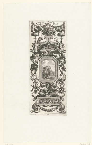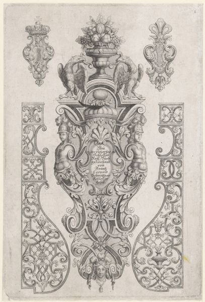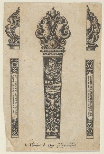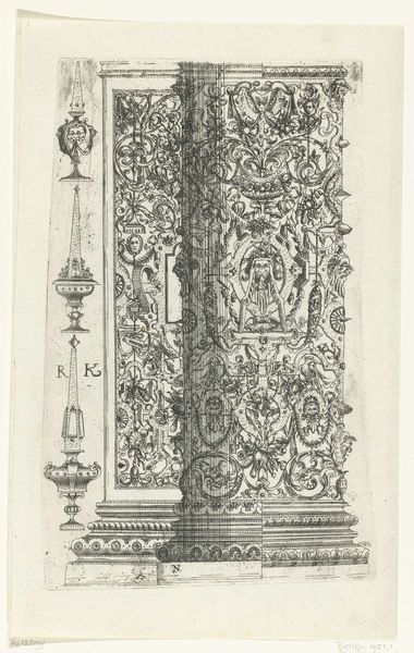 Editor: We’re looking at "Kandelaber met triton en viool" (Candelabra with Triton and Violin) made between 1505 and 1515 by Zoan Andrea. It’s an engraving, and what strikes me is the incredible detail achieved with line work. What's your read on it? Curator: Let's consider the production of this piece. It's not simply an image, but an object made with tools and labor. How might the fact that it is an engraving – a repeatable image intended for dissemination – shape its meaning? The materials—ink, paper, the metal plate from which it's printed—are not neutral. They speak to systems of craft, trade, and patronage. Editor: I see your point! It’s easy to get lost in the imagery itself – the triton, the musical instruments. So you're suggesting it’s important to also think about the economic system that makes this kind of print possible? Curator: Exactly! Look at the meticulous execution of line and the way it simulates depth. This speaks to skilled craftsmanship, likely within a workshop setting, with hierarchies of labor at play. What kind of access would people have had to images like this? Would this impact its artistic status, compared to unique painted artworks for the wealthy? Editor: So, it's both art and commodity? That definitely shifts how I see it. What do you think someone might use it for? As inspiration or as a sourcebook for other artisans perhaps? Curator: Precisely. These prints served as models, readily consumed and adapted across various crafts. Its materiality and production become part of the image's overall impact. Editor: This has given me a completely new angle on understanding art of this era; thinking about the means of production is fascinating. Curator: Indeed! By looking at the physical properties and social context, we avoid the traditional art history trap of simply focusing on authorship or aesthetic beauty.
