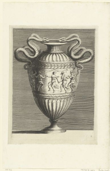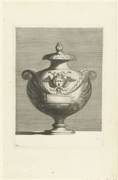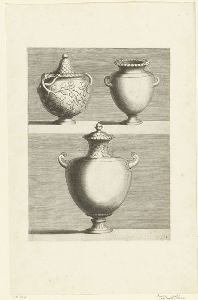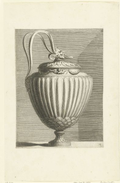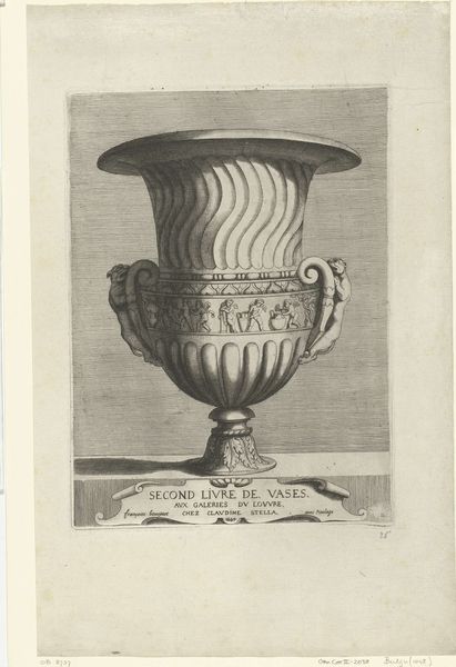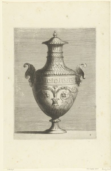 Editor: Here we have Françoise Bouzonnet's "Vase with Scales and Lobes" from 1657, an engraving on metal. It looks so precise. What can you tell me about it? Curator: Well, on the surface, this appears to be a straightforward representation of an object. But let’s consider the function of ornament during the Baroque period. What kind of statement was the owner making through its display? Remember, this was a period deeply engaged with social hierarchies and status. Editor: I guess the vase becomes more than just a vase. Curator: Exactly! It's a declaration. Bouzonnet's engraving, by documenting such objects, participates in the circulation and perhaps even idealization of these markers of wealth. Who had access to such prints? Who could afford the actual vase? What kind of person was it meant for? Editor: So the engraving almost democratizes access, even if it's just visually. Curator: Precisely! And we need to be aware of this inherent contradiction. What message are we conveying when we are displaying it today? Should it be considered an art piece that embodies history, class and capitalism of its time? Editor: It's really amazing to think about all of that – the context, the statement, and what it all means today. I hadn't thought of it that way. Curator: Seeing art as entangled with social dynamics makes art history so much richer, doesn’t it? There's always something more to uncover.