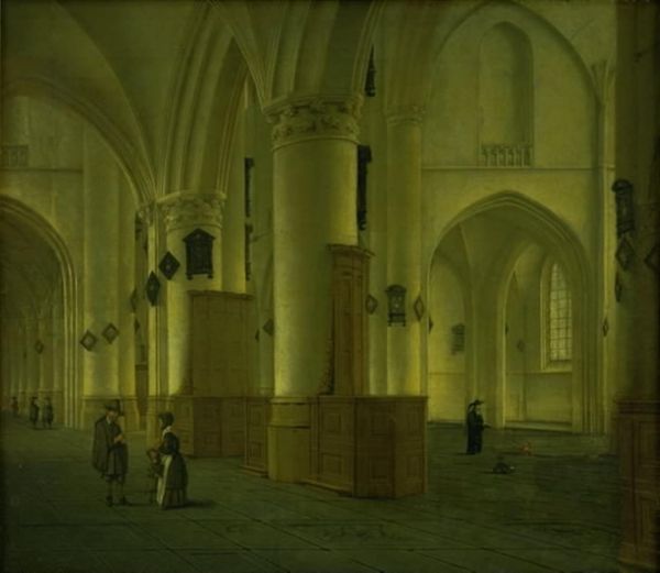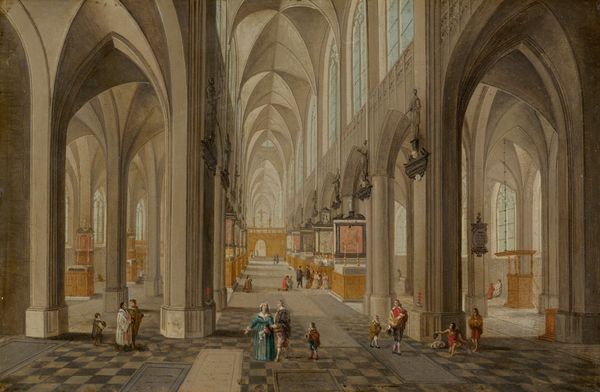 Curator: The atmosphere in this image is striking – almost hushed. Editor: Yes, there's a deliberate calmness to Peeter Neeffs' "Interior of an Imaginary Gothic Church, Looking East," dating from around 1655-1660. Look at the checkered floor; it gives a sense of spatial order in contrast to the grand scale of the church itself. Curator: Indeed, that chequered floor points to labor and craft. Each tile carefully placed, a grounding element in this enormous, faith-driven space. But let's talk about materials. What can you tell us about how Neeffs created this? Editor: Neeffs used oil paints, allowing him to capture intricate details and create depth with light and shadow. Now, thinking historically, these church interiors became popular subjects for artists like Neeffs in the 17th century, a reflection of the socio-political power structures and religious fervor of the time. Cathedrals represented not only religious belief but also civic pride and economic prosperity, after all. Curator: Absolutely. The painting depicts more than a house of worship; it reflects production in its making. Neeffs didn't just conjure this space from imagination. His understanding of architecture and material application translates into this compelling representation. But did he intend any subtle criticism regarding wealth accumulation by portraying such a grandiose site of expenditure? Editor: It’s hard to say definitively without knowing more about his patronage, but it's a good question. Considering the public role of art then, the imagery might well address notions of earthly versus spiritual power or piety and how they come to relate within such massive religious sites. The inclusion of figures, seemingly dwarfed by their surroundings, also highlights this. Curator: They emphasize the scale while demonstrating society organized within and because of the structures people construct. They almost appear lost, their presence reminding viewers of their small role amidst it all. I can imagine viewing it in a private collection – thinking of one’s place amongst capital and societal structures. Editor: So we see art functioning here, both historically and materially: displaying existing social conditions, and perhaps causing new understandings of societal relationships. Curator: Precisely! Seeing this interior laid out for a viewer highlights power as well as artistry. Editor: Ultimately, a wonderful interplay between artistic representation and historical context.
