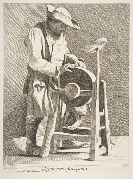 Editor: Here we have "The Knife Sharpener," an undated print by an anonymous artist. I'm struck by the stark contrast of light and shadow and the subject's humble attire. What can you tell me about its historical context? Curator: Consider how prints like this circulated, making images of working-class figures accessible. This circulation shaped perceptions and contributed to a broader cultural understanding, and, perhaps, even romanticization of labor. What do you make of the detail in the subject's clothing? Editor: It looks worn. Perhaps the artist is making a statement about the dignity of labor despite hardship. Curator: Precisely. And the anonymity? Perhaps this was meant to depict not an individual, but a type. A universal figure. We see images of labor often tied to cultural and social values. It begs the question, who is this work really for? Editor: Interesting. I hadn't considered the audience and the potential message of the work itself. Curator: Thinking about the "who" and "why" behind an image helps us consider its impact, its legacy.