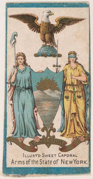 This small card depicting New York, part of the Flags of the States and Territories series, was printed by Allen & Ginter for their cigarette brands. These cards were made using chromolithography, a technique involving multiple stones to apply different colors, creating a vibrant image. The card is visually divided into different parts: the state flag in the upper part, a view of New York harbor in the lower part, and the brand name in the lower register. The flag itself is replete with allegorical images relating to the state's identity. This elaborate design would have been painstaking, yet they were produced in huge quantities. The card speaks to the rise of consumer culture and industrial production. It blurs the lines between commerce, art, and state identity. Such cards were essentially advertisements, mass-produced through complex labor processes, inserted into cigarette packs to encourage collecting. The production of these cards required not only skilled artists but also factory workers operating printing machinery. By considering the material and social context, we see how even a small, mass-produced item like this reveals the interweaving of art, labor, and capitalism.