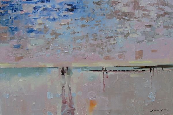 John Miller’s ‘Godrevy Lighthouse’ is an exploration of landscape, light, and the materiality of paint itself. The painting is created with bold, expressive brushstrokes of oil paint, a traditional medium with a long history. Miller’s application of paint is quite direct. The colors are vivid and somewhat unnaturalistic, which suggests an interest in capturing the essence of a scene rather than a photographic likeness. We can clearly see how the paint has been applied, with thick impasto in areas, adding a tactile quality to the work. By emphasizing the materiality of the paint, Miller invites us to consider the labor involved in creating the image. The brushstrokes reveal the artist’s physical engagement with the canvas. The way Miller manipulates his materials is part of the experience of this painting, which sits between the traditions of landscape art and the more self-conscious concerns of modernist painting.
