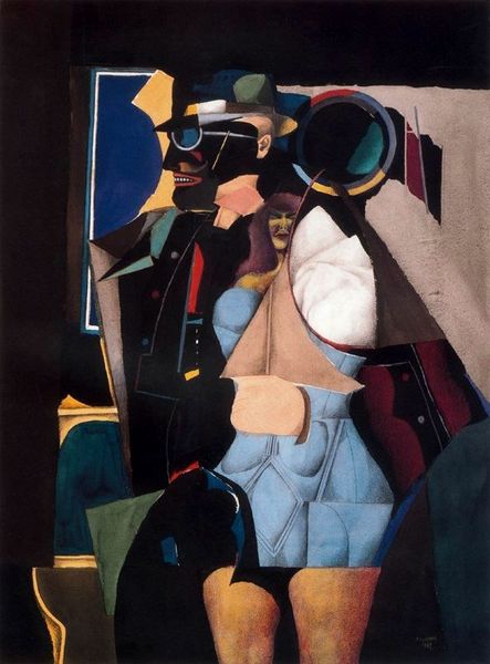 Editor: This is "El Quinteto" by Emilio Pettoruti, it’s an oil painting with geometric and cubist features depicting five musicians in what looks like an outdoor concert. The tones are pretty muted, mostly browns and beiges. What I find fascinating is how the artist abstracted human figures. How do you approach this kind of modernist painting? Curator: Well, what strikes me first is how Pettoruti engaged with European modernism but infused it with his own cultural context. Cubism, originating in Europe, represented a break from traditional representation, reflecting the fragmentation and dynamism of modern life. But Pettoruti, an Argentinian artist, seems to be commenting on that tradition. Notice how he presents the musicians? Are they celebrating something, or is there perhaps a satirical element at play? What's your impression? Editor: I guess I see a blend of both. They look dignified, almost like a high society band, yet the geometric distortions feel almost mocking, like caricatures. Maybe it is satire on the European tradition. Curator: Exactly! Pettoruti's "El Quinteto" can be seen as a postcolonial gesture. He appropriates the language of European modernism – cubism, geometric abstraction – but repurposes it to reflect South American identity, culture, and perhaps even social critique. Where might you imagine this performance taking place, and how does the implied setting contribute to the meaning of the work? Editor: Somewhere in South America I'd assume. Maybe it is a street band playing for an elite crowd. So the buildings in the background might reinforce the idea of them being an established cultural force in the region. Curator: Precisely. By depicting these musicians in a fragmented, yet structured way, Pettoruti is making a statement about the complexities of cultural identity in a world grappling with modernism and post-colonial realities. So what do you take away now? Editor: I see a powerful visual argument about cultural appropriation, adaptation, and social critique woven into a cubist style. The European visual language applied to South American musicians gives them a modern tone that creates an important blend of cultures, and maybe a bit of satire too. Curator: Indeed. It encourages us to look beyond the surface and consider the deeper cultural and political dialogues at play.