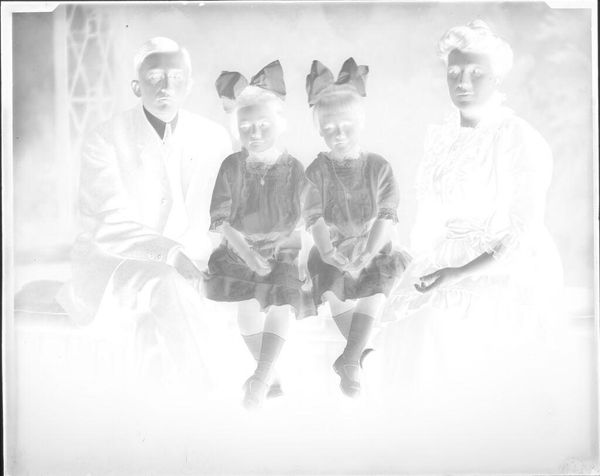 Editor: This ghostly image, an untitled family portrait by Hamblin Studio, really grabs you. I find it so haunting—almost like looking at a memory fading away. What can you tell me about it? Curator: It's intriguing, isn't it? The reversal of tones gives it an ethereal quality, like peering into another dimension. Perhaps the family wanted to capture more than just their likenesses... a sense of their shared identity. Editor: Do you think they achieved that? Curator: In a way, yes. The formality, combined with the otherworldly rendering, creates a powerful tension. It reminds me that every photograph is a negotiation between what's present and what’s absent. So poignant! Editor: I never thought about it that way. I'll definitely remember that. Thanks!