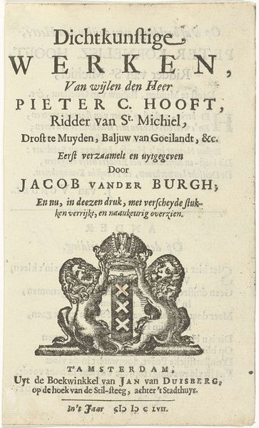 Curator: It’s fascinating how typography itself can become art, isn't it? Editor: Absolutely. My first impression is of controlled chaos—so much text, yet the lettering choices and layout feel surprisingly balanced. Almost like an intricate tapestry of words. Curator: Indeed. What we have here is a title page created in 1689 by Carel Allard. It's titled "Typografische titelpagina voor: L. Smids, Oranjes overtogt naar Engeland: of beschryvinge van Romein de Hooges printen." The Rijksmuseum holds this particular print. Editor: Ah, Allard! That clarifies the historical context somewhat. The piece promises a description of Romein de Hooghe’s prints, specifically those concerning the ascent of the House of Orange in England. A clear attempt to visually represent power and historical narrative through design. Curator: Exactly. You can see it wasn't simply about legibility. The various sizes and weights of the fonts surely would have signaled the hierarchy of information. The hand-lettering elements also speak to an intimate, handcrafted quality that's been mostly lost to digital typefaces today. Editor: The deliberate aging is powerful—the paper, the ink. The entire work exudes the weight of history, like a monument wrought in paper and ink, reflecting on the political shifts and consolidation of power occurring at the time. Does it subtly attempt to give that sense of established continuity by giving it this classical presentation? Curator: I believe that's part of it. It’s interesting to me how the floral flourishes add a decorative element but also remind me of the Dutch Golden Age obsession with symbolism—possibly alluding to themes of prosperity and divine blessing upon the House of Orange. Editor: I’m especially drawn to the contrast between the almost rigid structure of the main title and the flowing, descriptive text beneath. It mirrors the transition from abstract concept – the 'overtogt,' the crossing – to concrete representation in De Hooghe's prints. A clever interplay between idea and image. Curator: Reflecting upon our brief observation, this typographic page does more than just present information. It embodies a carefully constructed image, deeply rooted in both artistic conventions and socio-political aspirations of its time. Editor: Indeed. Looking at it through this lens, we can begin to see it not only as historical artifact, but as a testament to the subtle but effective art of visual persuasion.