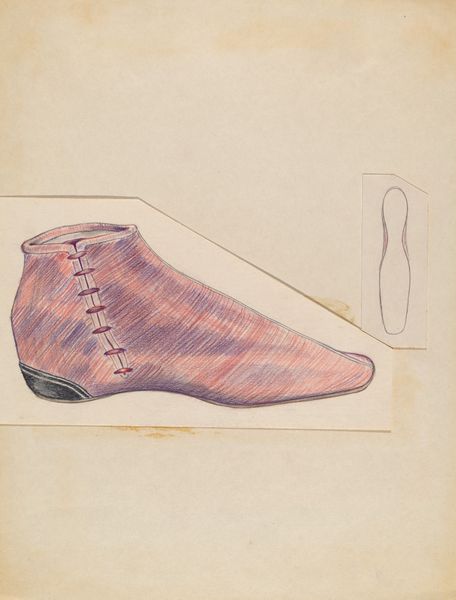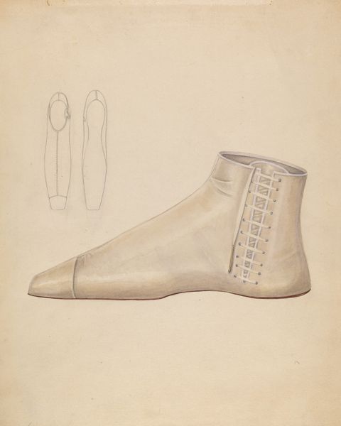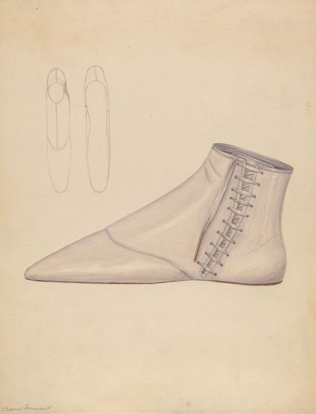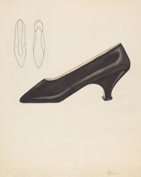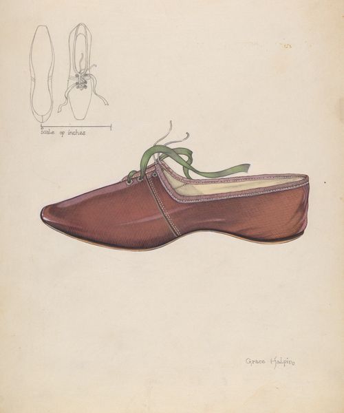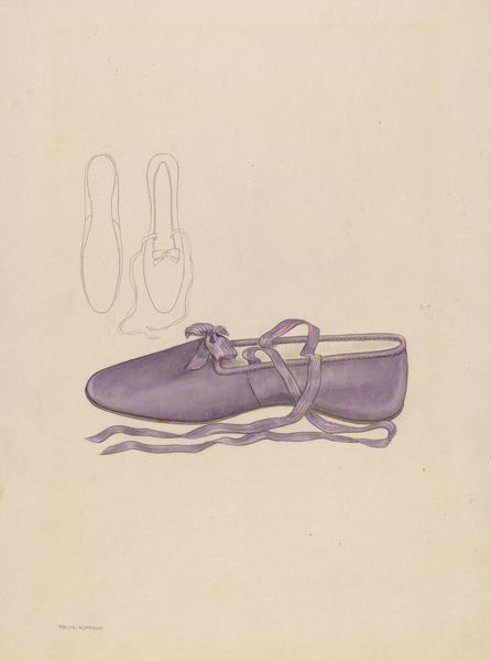 Editor: So, this lovely drawing, "Slipper," circa 1936, by Gladys Cook. It's a pencil and paper work, very delicate. The drawing-like depiction adds an almost nostalgic air. What draws your eye to it? Curator: The deliberate depiction of the slipper's form speaks to the artist’s engagement with the culture of fashion and its labor-intensive processes. Notice the subtle rendering of the ribbon. This evokes a reflection of social realities embedded within everyday objects, questioning who makes these objects and for whom. Do you see that connection? Editor: That's interesting. I was initially caught up in the aesthetic, the details, but now I think about what a shoe like that would have meant, who wore it, who made it…the materials, the labor! Curator: Exactly. How does Cook employ the medium of pencil and paper in order to question distinctions between 'fine art' and the more traditionally gendered field of fashion illustration? Does the ephemerality of the materials reflect something about the consumerism tied into fashion itself? Editor: That definitely complicates how I saw it initially! I was seeing it as just this pretty little slipper but the act of creating this piece highlights its consumer function as an object. Almost elevating what might be viewed as functional to fine art and perhaps a little subversive. Curator: Precisely. And we have to acknowledge the implied labor through the choice of medium, drawing compared to painting and sculpture which often held a higher value. Editor: Seeing it from that perspective really gives the artwork new depth! Thank you. Curator: Indeed. Thinking about art this way brings everyday experiences into sharp focus.