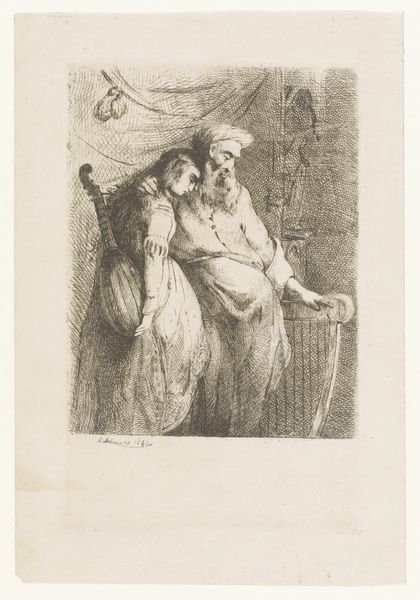 Editor: So, here we have Charles Rochussen’s pencil drawing, "Scène uit toneeldrama Marie Antoinette," created between 1865 and 1868. It’s currently housed here at the Rijksmuseum. I'm immediately struck by the chaotic arrangement of figures. How would you interpret the composition of this piece? Curator: Formally, we observe a dynamic interplay of light and shadow achieved through the delicate graphite medium. Note the artist's deliberate use of hatching and cross-hatching to create tonal variations and textures, especially visible in the drapery and the rendering of the figures' emotions. The arrangement, though seemingly disorganized, contributes to an overall sense of dramatic tension. How does the scale contribute to the artwork's intrinsic value? Editor: It's interesting to consider that scale does influence impact, but I don’t see how it contributes to its “intrinsic” value. Is it the technical execution or visual arrangement, or something else that stands out to you in terms of “intrinsic” artistic worth? Curator: The intrinsic qualities, precisely. Observe how the artist manipulates the graphite medium to portray varying degrees of emotional intensity – from the pronounced grief in the foreground to the distant, ghostly apparition. It is through the close analysis of these formal properties – the use of line, tone, and texture – that the drawing generates such dramatic tension in absence of color, while portraying Marie Antoinette and her cadre's tragedy. Does the technical precision in this artwork impress you, regardless of theme or cultural context? Editor: Absolutely. I see how focusing on those techniques provides a framework to consider it objectively. It's not just a historical scene, but a study in emotion communicated through skillful use of a pencil! Curator: Precisely! Shifting our focus from mere representation to the very language the artist uses – line, form, texture – unlocks a deeper appreciation for the artwork's intrinsic structure, enriching our formal, structured response.