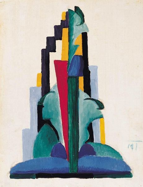 Editor: So, here we have "Composition" by Janos Mattis-Teutsch, painted in 1925. It’s an acrylic painting, and I’m struck by how these stacked geometric shapes feel both balanced and precarious at the same time. How do you interpret this work? Curator: That tension is key. Looking at "Composition," I see echoes of early 20th-century utopianism crashing against the realities of the interwar period. Mattis-Teutsch, deeply influenced by expressionism and the search for spiritual renewal, created these abstract forms to evoke universal harmonies. But can we truly divorce abstraction from the social upheavals of its time? Editor: I hadn’t thought of it that way. The bright colours seemed optimistic, but now I see a kind of… fragility. Like the dream of perfect social order is vulnerable. Curator: Exactly. Think about the rise of fascism, the fracturing of empires – all happening as artists were exploring these radically new visual languages. Does this geometric stacking, this striving for balance, become a metaphor for societal hopes clinging on for dear life? Consider also the painting’s defiance of traditional representation, could this rejection mirror the rejection of outdated social structures? Editor: So, the artwork isn’t just about shapes and colours, but about the artist responding to a specific historical moment and all its complexities? Curator: Precisely. It asks us to consider: whose voices were amplified, and whose were suppressed, in the clamor for progress? Where do we find our own points of connection, and our own unease, within these supposedly universal forms? Editor: That gives me so much to think about. I’m beginning to see abstraction as less of an escape and more of a reflection of the world around it. Curator: Indeed. And hopefully a provocation to reimagine it.