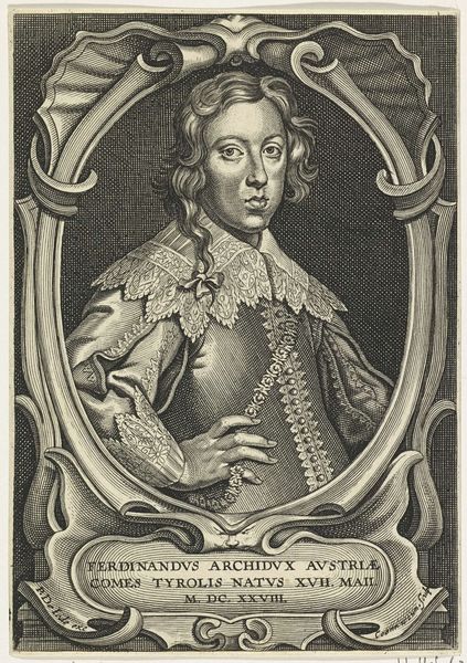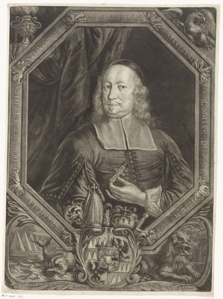 Editor: This is a print from 1656, a portrait of Johan de Brune by Theodor Matham. It's striking how much detail is packed into such a small engraving! It seems very formal, almost severe. What stands out to you when you look at it? Curator: The symbolic framework is what grabs me immediately. Look closely – above Johan de Brune’s head, we see “SPE ET METU.” Hope and Fear. A very humanistic tension to introduce a portrait. Does that interplay of opposing forces tell us something about how De Brune saw himself, or how he wished to be perceived? Editor: Hope and Fear... That's interesting. I hadn't considered it going beyond just a biographical portrait. Does his clothing signify anything particular, then? Curator: Absolutely. His attire, though seemingly simple, speaks to his status and role as Raed-Pensionaris, effectively a legal advisor, suggested here by the subtle but defined legal bands, while the curtain behind hints at a theatricality that would be fitting for someone in the public eye. It's a calculated image. What do *you* see as being ‘staged’ here? Editor: I suppose the text is also staged, presented in an ornamental cartouche to amplify Johan de Brune’s status. It’s not just a name; it's a statement. I learned that even in portraiture, artists employed deliberate symbolism! Curator: Indeed. The symbolic language embedded within portraits is incredibly powerful in conveying both individual identity and collective memory, speaking volumes about a culture’s values and self-perception.