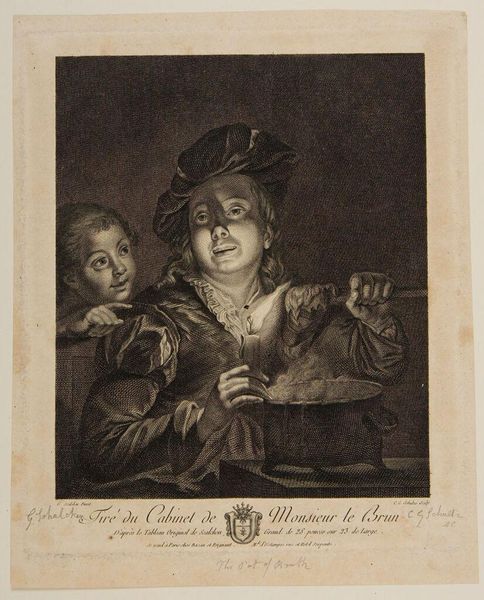 Curator: This engraving by Francesco del Pedro is titled "Music." Editor: It strikes me as a peculiar composition. The figures seem trapped between youth and age, joy and melancholy. Curator: Note the contrast in textures, from the boy's roughspun cap to the girl's delicate fabric. Consider how printmaking democratized art production. Editor: The girl holds sheet music. Notice how the repetition of notes evokes a sense of rhythmic order, a symbol of harmony against the backdrop of human transience. Curator: Yes, the labor of creating these reproducible images also made art accessible beyond elite circles, influencing social norms. Editor: I find myself pondering on the emotional narrative—innocence, fleeting beauty, and the inevitable presence of mortality. Curator: I'm more interested in how the production and consumption of these prints impacted the burgeoning middle class. Editor: Ultimately, it’s a poignant exploration of the ephemeral nature of beauty, isn't it? Curator: Perhaps. Or a testament to the power of reproducible art in shaping a broader culture.