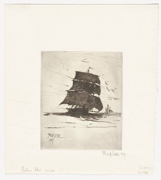 Curator: Isn’t this just gorgeous? “Zeilschip op kalme zee onder de sterrenhemel” – or, “Sailing Ship on a Calm Sea under a Starry Sky.” It’s a print, an etching and engraving to be exact, by Reinier Vinkeles, created sometime between 1764 and 1816, and it lives here at the Rijksmuseum. Editor: Wow, immediately, it feels like pure romantic yearning. A tiny ship bravely facing an enormous, luminous cosmos. You can almost feel the cool night air and smell the salt water, can't you? Curator: Absolutely! Vinkeles was really capturing that burgeoning Romantic sensibility, where nature is this powerful, awe-inspiring force, indifferent to human endeavor, yet here, with a small ship bravely forging on. It’s as if humankind itself is making its mark in nature. The scale is really key to creating that mood, the juxtaposition between this big sky and a small vessel trying to make its mark. Editor: And this print medium allows the image to reach a far wider audience than, say, an oil painting, making the emotional impact of Romanticism much more widely available and also maybe creating that "humankind versus nature" drama in everyday lives through consumption? How democratic. Curator: Yes, precisely! Prints like this democratized art, bringing these grand themes to a wider public and fostering a sense of shared cultural experience. Before mass digital image distribution, prints had great social power. People would have actually _felt_ connected by this piece. You see similar prints traded among the social elite of London in the early 1800's as well! Editor: It's incredible how a simple image can carry such a potent message. Looking at it now, it makes you wonder about our own relationship with nature today. Curator: Right! And maybe this small picture is a question to the ages: do we make an impact on the infinite vastness or do we just exist within its boundaries? Thank you for contemplating that with me!