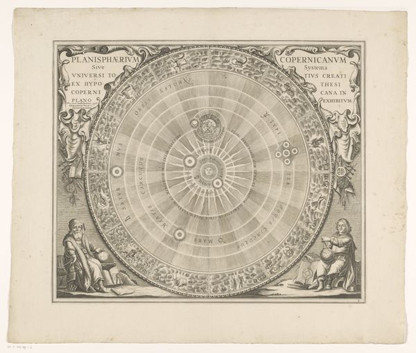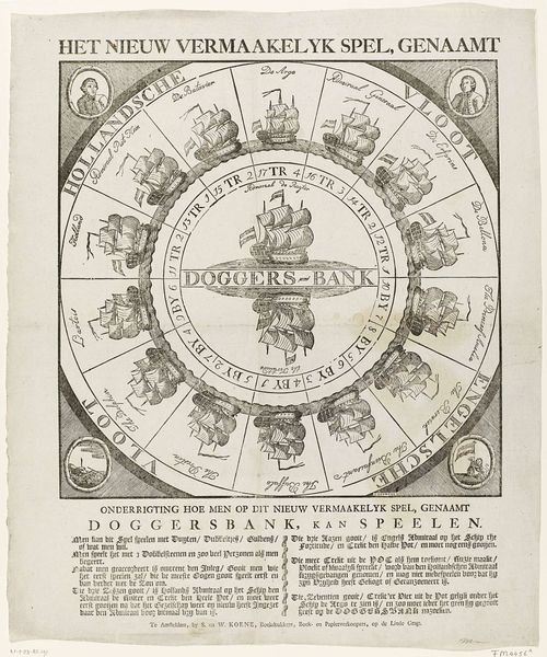 Curator: First impressions? To me, it feels like stumbling upon some arcane puzzle, a curious game dreamt up long ago. Editor: Exactly! This fascinating engraving and etching, "Uilenspel," was produced sometime between 1818 and 1845 by Mindermann & Co., right here in Amsterdam. Curator: "Uilenspel," Owl's Play...that central image of the owl is just…oddly comforting amidst all this seemingly chaotic symbolism. The rose and other flora bordering the image offer an intuitive sense of life bursting out of the artwork's design, an illustration speaking to hidden and secretive societies and beliefs. What am I supposed to be seeing, really? Editor: Well, consider how the composition is organized around the owl, an emblem of wisdom but also of the nocturnal, the hidden. Each symbol and letter set in concentric circles speaks a cryptic message— the print serves as a kind of game board and manual all in one. Its aesthetic invites an interpretation based on Dutch Golden Age pictorial traditions. Curator: So, not just decoration; these images point to a whole secret world with a whole society. It definitely reads as playful with just a tinge of…menace. Like I am not really supposed to understand it all. Editor: Precisely! Etchings like this provided more than simple entertainment; they visually encoded complex societal commentaries, accessible on several layers. It makes you wonder what games people invented, or even how the rules were meant to be interpreted. Curator: Rules or not, that owl has something up its sleeve. So glad to feel just a sliver closer to its time, even without knowing exactly the rules of the Uilenspel. Editor: Absolutely! It remains an open invitation, then, for anyone with a mind to unravel the past in images and imagine Dutch society during that time.