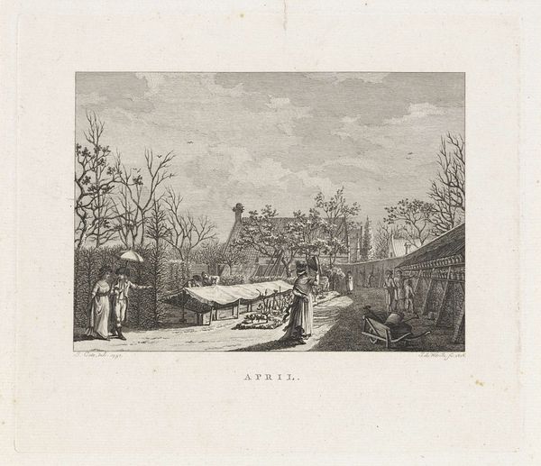 Izaak Jansz de Wit created this print, Two Farmers Harvesting Hay, using etching. The composition presents a tranquil rural scene dominated by horizontal lines, reinforcing a sense of calm and stability. De Wit employs a limited tonal range to depict farmers at work. The texture of the haystacks and the water is conveyed through delicate, closely-spaced lines, creating an almost tactile experience. The placement of the farmers and animals directs the viewer’s eye across the landscape, moving from foreground to the distant village. The print offers a window into 18th-century Dutch agrarian life, idealizing labor and the natural world. De Wit captures the rhythms of rural existence and prompts reflection on our relationship with nature and the passage of time. The serene atmosphere invites us to contemplate the enduring appeal of the pastoral tradition in art.