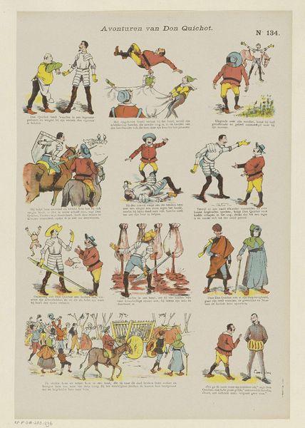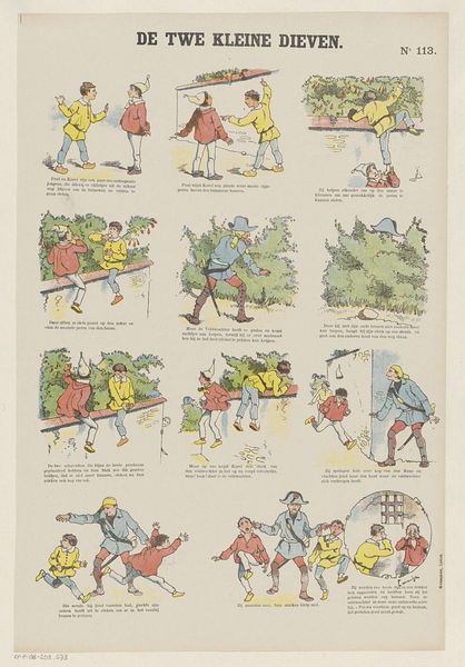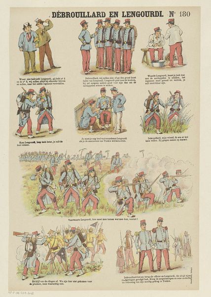 Curator: Firmin Bouisset’s lithograph, titled “Aan het strand”, or “On the Beach,” made sometime between 1876 and 1891, immediately presents a charming, almost naive, visual narrative. What's your first take? Editor: Well, it certainly exudes a sense of innocent play. The palette is subdued, almost faded, lending an antique charm to the sequential scenes of children at the beach, giving an overall mood that is pleasant but somewhat static in tone. Curator: Absolutely. Considering the historical context, this lithograph provides insights into leisure activities and childhood in late 19th-century Europe. The emergent middle class began to regard childhood differently. Editor: True. However, I'm particularly interested in the composition. It seems structured like a comic strip or a children's book illustration. The narrative unfolds through these separate panels showing the children interacting with each other, with toys, and most notably, with a crab! Curator: Indeed! Notice how Bouisset uses line and color minimally, yet effectively, to delineate forms and spaces. The subtle color variations lend depth while maintaining the flatness inherent in the printing process. Semiotically, each panel represents a discrete unit of meaning that, when combined, produces a simple but relatable tale. Editor: From a social history perspective, the inclusion of a fisherman interacting with the children tells of both opportunity and commerce within these new leisure spaces. How this moment is illustrated and represented is also of importance, presenting children, crab, and working class figures as interacting across the emerging social divides. Curator: Precisely! While seemingly lighthearted, it reflects evolving attitudes toward leisure and social dynamics. Editor: I am left considering how artists reflect, but also create the spaces and interactions as understood in collective memories and lived social relations. Curator: This lithograph indeed acts as a window into a bygone era, skillfully presenting not just its aesthetic values but a set of historically determined realities.