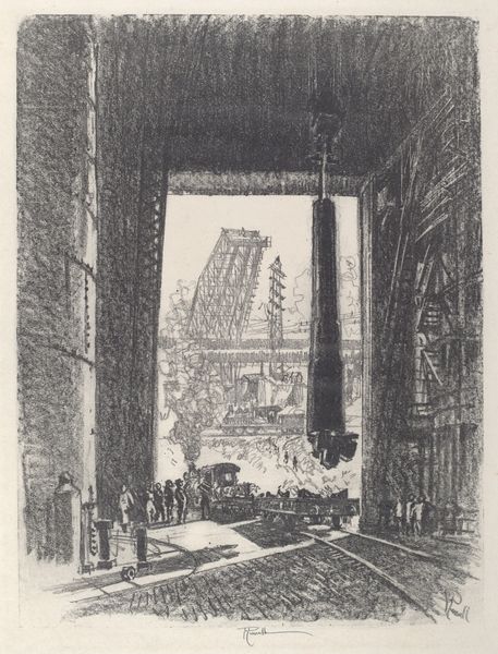 Joseph Pennell created this print, "The Flying Locomotive", during an era of immense industrial expansion. Pennell, an American expatriate, lived in London at the time. Here, the locomotive is a symbol of both progress and the potential for dehumanization. The locomotive appears suspended, almost flying, amidst the cathedral-like space of the factory, yet the small figures below are dwarfed by the sheer scale of the machine. The print encapsulates the complex relationship between humans and machines at the beginning of the 20th century, embodying a sense of awe and apprehension. Consider the emotional impact of the scene: the bright, ethereal light contrasting with the dark, looming presence of the locomotive. Pennell's work urges us to reflect on the human cost of industrial advancement, capturing the hope and anxiety of an era defined by rapid technological change.