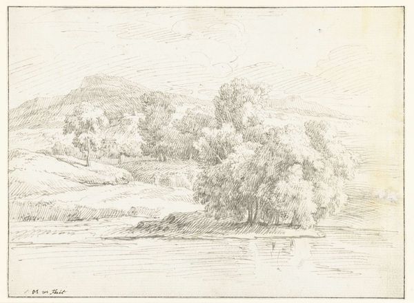 Abraham Teerlink rendered this landscape study with buildings using pen in the 18th or 19th century. Here, the rocky terrain and the architectural ruins speak to the enduring allure of classical antiquity, a period whose motifs, like the Doric order, still resonate with symbolic weight. The trees clustered in the background evoke both serenity and an awareness of nature's untamed power. Consider the architectural structures, almost concealed within the landscape. These forms echo the classical ideals of order and harmony found in ancient Roman villas. In Renaissance art, such ruins symbolized the passage of time and the ephemeral nature of human achievement. They are a type of *memento mori*, reminding us of our mortality and of the transience of earthly glory. These images speak to a collective memory, resurfacing and evolving across centuries, each time coloured by new cultural and emotional valences.