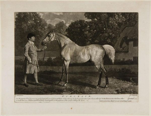Editor: Here we have Richard Houston’s engraving, "Racepaard met jockey", placing it somewhere between 1731 and 1775. The horse dominates the composition, possessing an almost regal quality. The jockey seems diminutive in comparison. How do you interpret this work? Curator: The horse certainly stands as the primary symbol here. Beyond just being a representation of an animal, it’s charged with significance. Think about the history embedded in the image. This isn't simply a horse; it is a racehorse, tied to aristocracy, wealth, and leisure. The jockey, then, becomes a figure of service and class distinction, literally holding the reins of power. Do you see how the size differential underscores this dynamic? Editor: Absolutely, it’s hard to miss. But what about the landscape itself? It seems deliberately understated. Curator: Indeed. The subdued landscape acts as a stage, highlighting the central figures and allowing them to command our attention. It avoids distraction, guiding our gaze back to the cultural symbolism inherent in the relationship between the horse, the jockey, and, by extension, the societal structure they represent. It's a world of inherited status. Editor: That makes sense. The emphasis on the horse as a status symbol… It's something I hadn’t fully considered. I was mostly thinking about aesthetics, but you’ve shown me so much more in terms of historical and societal symbols. Curator: And you've reminded me that aesthetics serve as a powerful conveyor of these underlying stories. It's a dialogue between image and context that allows us to uncover so much.