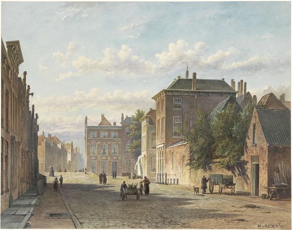 Editor: Here we have John Sell Cotman's "Norwich Market-Place." It's undated, but Cotman lived from 1782 to 1842. It feels like a bustling snapshot of everyday life. How do you interpret its depiction of public space? Curator: Cotman captures the marketplace not just as a site of commerce, but as a stage for social interaction. Notice how the architecture frames the scene. How does this composition affect your understanding of Norwich's civic identity at that time? Editor: I see how the buildings give it a sense of place and permanence. It makes the market feel central to the city's identity. Curator: Precisely. Consider also the politics of visibility. Who is represented, and how? The painting becomes a document of social hierarchy, reflecting the power dynamics inherent in public spaces. What did you observe? Editor: I noticed the variety of people and animals, but I hadn't considered the social implications of their placement. It's like the artwork invites us to see the market through a socio-political lens. Curator: Exactly! Cotman's marketplace transcends mere representation; it becomes a historical artifact, revealing the intricate relationships between art, society, and power.