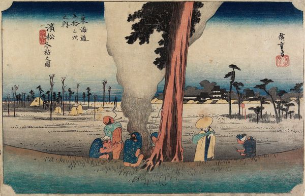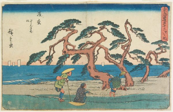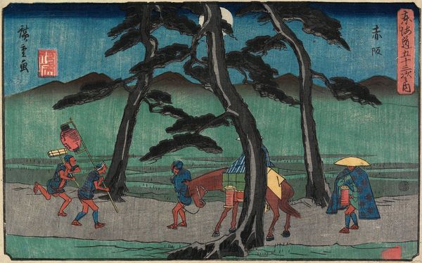 Curator: Utagawa Hiroshige's woodblock print, titled "Akasaka," from 1841 to 1842, now at the Minneapolis Institute of Art, immediately evokes a specific mood, doesn't it? Editor: Indeed. There's an unmistakable atmospheric quality. The stark contrast between the dark trees and the lighter horizon lends it a melancholic, almost eerie air. The materiality of the woodblock print contributes, of course; the ink soaking into the paper creates a palpable texture. Curator: The composition directs our gaze cleverly. Note how the towering pine trees frame the human figures, guiding the eye to follow their journey along what seems like a bustling nighttime path. The scene relies heavily on linear perspective, albeit stylized, creating a deep sense of space. Editor: But consider the socio-economic context, too. These figures are carrying lanterns, likely engaging in commerce or transportation. Woodblock prints weren’t just artistic endeavors but vital means of circulating information and stories among the masses. This wasn't high art exclusively, but mass production reflecting societal movement and labor. Curator: Agreed, but I'm drawn to the symbolic density. The moon, subtly rendered in the upper background, offers a touch of romanticism that interacts powerfully with the earth-bound procession below. The indigo shades for sky and water lend a certain unity, echoed by touches in the travellers' clothing. Editor: Right, and it’s worth investigating the print-making process itself. Hiroshige and his block carvers and printers were artisans. The final artwork required collaboration, and an examination of these material and working conditions reveals much about the status of labor during that period in Japan. We get this beautiful final result through very physical means. Curator: Absolutely. And, the stylistic execution enhances the content. Hiroshige’s careful blending of colors, particularly within the gradation of the sky, suggests meticulous craftmanship, contributing to the dreamlike visual field that the landscape engenders. Editor: For me, this work illuminates the integration of art within broader structures of labor and industry. It demonstrates the importance of investigating the physical and collaborative nature behind these artifacts we so admire today. Curator: Ultimately, considering the balanced design elements with Hiroshige's chosen thematic features, "Akasaka" provides insight into 19th-century Japanese culture, both aesthetically and emotionally. Editor: A perfect nexus between social reflection and creative rendering, revealing truths through process and perspective.