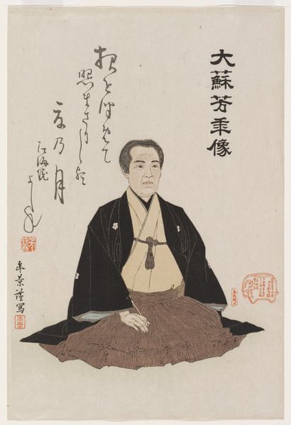 Curator: Editor: Here we have Utagawa Yoshiiku's "Memorial Portrait of the Artist Utagawa Kuniyoshi," a woodblock print from 1861, currently held at the Art Institute of Chicago. I am struck by the overall tone—melancholy but dignified. What's your take? Curator: That's a perceptive observation. I see a potent dialogue happening here. Kuniyoshi, a renowned Ukiyo-e master, is being memorialized. This image becomes an active intervention, pushing back against the ephemeral nature of life and art. Yoshiiku is not just creating a likeness; he's engaging in a cultural act of remembrance, situated within the socio-political landscape of the late Edo period. What does the inclusion of calligraphy suggest to you? Editor: It’s almost like a collaboration that transcends death… but what exactly do the inscriptions mean, and how do they work within that landscape you mentioned? Curator: Precisely! The inscriptions, likely a eulogy or memorial poem, deepen our understanding of Kuniyoshi's cultural impact. Consider that Ukiyo-e, while popular, often depicted the floating world – entertainment, courtesans, actors. This portrait elevates Kuniyoshi, acknowledging his artistry, but simultaneously existing as a commercial print. It highlights the complex relationship between art, patronage, and social status in that era. Editor: So, it's about democratizing access to memory and reputation? Curator: Exactly. It makes me wonder, in what ways did the proliferation of prints allow for wider participation in constructing cultural narratives? It certainly highlights the political charge inherent in portraiture. How might this memorial portrait challenge conventional power structures within the art world of the time? Editor: Wow, I hadn’t considered how much this image opens up! It's fascinating how a portrait can simultaneously celebrate an individual and reveal broader social dynamics. Curator: Indeed, it makes you think about how we memorialize artists today and who gets to control those narratives.