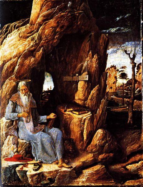 Giovanni Bellini painted “Saint Jerome in the Desert” around 1480, a tempera on panel work that reflects the complex intersection of religious devotion and humanist scholarship characteristic of the Italian Renaissance. Bellini’s placement of Saint Jerome, not as an ascetic figure of deprivation, but as a scholar amidst a carefully rendered landscape, speaks to a cultural shift towards valuing knowledge and earthly experience alongside spiritual pursuit. Jerome, traditionally a figure of the church is seen here as an individual immersed in study. The artist situates Jerome in a liminal space, between the wild, untamed desert and a distant cityscape, suggesting a dialogue between the natural world and human civilization, between the contemplative life and active engagement with society. Bellini captures the tensions inherent in the pursuit of knowledge: the solitary quest for understanding and how that quest can be rooted in tangible, material realities.