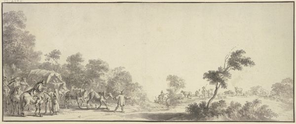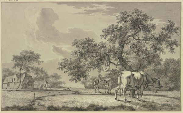 Curator: Let's spend a moment with Bernhard Heinrich Thier’s “Landscape with Tethered Bull,” rendered in ink drawing around 1777. It now resides at the Städel Museum. Editor: My first impression? Calm, but with an undercurrent of melancholy. That bull looks so… rooted. There's this sense of quiet restraint to it. Curator: Indeed. Thier really excelled in capturing tranquil pastoral scenes. Notice how the strong verticals of the tree and that solitary dead branch create these stark contrast with the open fields? Editor: Absolutely, the composition itself is so deliberate. It gives you a framework through these strong contrasts to understand an organic setting in terms of visual planes, I am seeing it broken down to triangles everywhere! It seems this geometry allows for your focus to shift constantly in search of harmony within those confines. Curator: The bull is prominently placed to pull your eye, no question. I like how its stillness really centers this open vista in a rather subtle fashion, allowing it to really sink in as this scene sort of hums with a life force we don't consciously recognize immediately. Editor: Exactly. You’re drawn to it, almost magnetically. And then that tethered rope… is it constraint, or is it protection? Curator: Perhaps a bit of both? Or maybe it symbolizes our own ties to the land, to our responsibilities. He gives so much form and dimension to those cloudy, muted sky sections... it brings a bit of emotional depth to an otherwise straightforward rendering, at least for me. Editor: Hmmm... I appreciate Thier’s precision. There is a realistic quality in his art as it captures the rural life. It reminds me how constructed these kinds of picturesque ideals really are. Curator: A keen insight! So what final emotion does it instill upon departing from the canvas? Editor: An interesting paradox; calmness laced with just a smidge of something pensive that lingers even as the composition vanishes from plain sight. Curator: It surely proves there’s an artistry, and intention, to these everyday scenes. Thank you for the added perspectives!