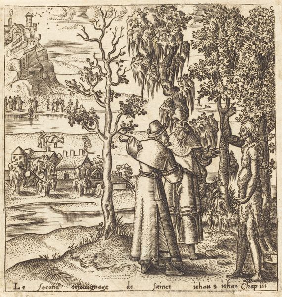 Curator: This engraving, titled "Christ Admonishes His Disciples" by Léonard Gaultier, dates from around 1576-1580. It's striking how much detail Gaultier achieves using just line. Editor: It's incredible the amount of story it can tell through simple means. How can one go about analyzing its impact as a complete composition? Curator: Indeed. Let’s begin with the structural elements. Notice the stark contrast, or the interplay between light and shadow, that models the figures and creates depth. Consider how Gaultier has distributed figures, architectural forms, and negative space across the two-dimensional surface, achieving what? Editor: Is it aiming for an unsettling imbalance, perhaps mirroring the tension in Christ's admonishment of his disciples? It seems that while there's symmetry between groups of people, it's still dynamic because they aren't posed exactly in the same positions. Curator: Precisely. That compositional tension is key. Gaultier uses varied line weights – observe the delicate, almost tentative lines describing the foliage, contrasted with the firm, decisive strokes defining the figures' drapery. How do these variations in linework contribute to the overall effect? Editor: So, it seems like through manipulation of scale and varying weights in each element creates an intended atmospheric tension to be percieved. Thank you so much. I have an eye for a more in-depth understanding. Curator: You're welcome. Focusing on the interplay between these structural elements unveils the artist's intention and amplifies the viewing experience. There’s much to be discovered with a careful and trained looking!