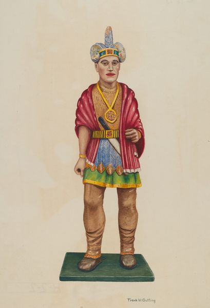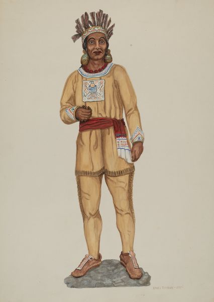 Curator: Oh, there’s something undeniably powerful about this image, isn’t there? It almost radiates authority. Editor: Indeed. This piece is entitled "Cigar Store Indian" by Emil Hagen, created around 1939 using pencil and charcoal. What we see represented here is a once-common sight: a wooden sculpture placed outside tobacco shops to attract customers. Hagen captured it with striking detail in this drawing. Curator: There's such stillness and solemnity in those eyes, even in a drawing of what was, essentially, an advertisement. Makes you think, doesn't it? It feels like he’s looking *through* us, and through all the layers of history, right back to… I don't know, something fundamental. And look at the color work and those carefully drawn feathered details, they’re just stunning. Editor: It's interesting you note that solemnity. Cigar store Indians, while meant to be inviting, became incredibly complicated symbols, entangled in colonialism and the romanticized, often inaccurate, portrayals of indigenous people. It reveals the contradictions within American commercial imagery and broader societal attitudes of the time. Curator: Complicated indeed. The entire premise is obviously rooted in exploitation and the objectification of a culture, I get it. Still, look at it now, rendered with such unexpected dignity and detail decades later—as if salvaged. Hagen has given it this almost ethereal beauty, despite its origin. Don't you feel a sliver of redemption in his sensitive realism? Editor: Redemption is perhaps too strong a word. What I do appreciate is Hagen’s attention to the materiality, drawing our attention back to these now largely vanished objects, symbols really, of a particular historical narrative. This forces a confrontation, a questioning, doesn't it? About our own relationship to history and representation. Curator: It truly does. Editor: Hagen's image serves as a poignant reminder that the most unassuming artifact can trigger powerful dialogues, forcing us to reconcile past injustices and to reimagine the ways in which we interact with it all. Curator: I agree. Hagen might have never anticipated that a simple drawing could speak such volumes. Makes me wonder if there is such a thing as truly simple art after all.