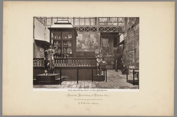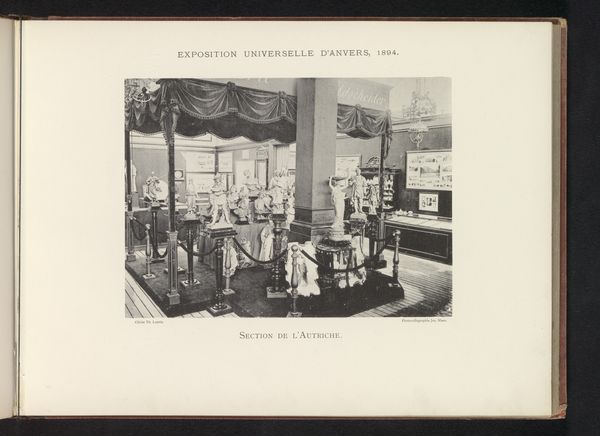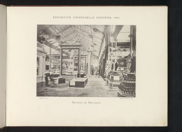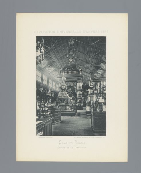 Curator: Right, so we are looking at a photograph entitled "Expositie van Duitse objecten tijdens de wereldtentoonstelling te Antwerpen," which translates to "Exhibition of German objects during the World Exhibition in Antwerp." It’s dated 1894 and attributed to Th. Lantin. What are your first thoughts? Editor: Wow, it’s... dense! Almost oppressively ornate. So much wood and carving. It feels very "old world power" – all that heavy detail suggesting wealth and industry. Makes me feel a little claustrophobic, even though it's a large space. Curator: That’s a very perceptive initial reading. We must understand world exhibitions, or world's fairs, were critical tools for nation-building and displays of colonial power. They functioned as sites for constructing national identities but also for disseminating ideas of racial and cultural hierarchies. Notice the German section of the exhibition. How does this representation project an image of German superiority, both materially and culturally? Editor: Right, okay, now I see it. Each vitrine and display looks like it is screaming, "Look at what we can do!" This isn’t just craftsmanship; it is a curated demonstration of industrial and artistic capability, packaged to intimidate and impress. I’m also struck by the people who seem like ants in this oversized showroom—insignificant against the manufactured prowess on display. Curator: Precisely. And think about Antwerp itself. Why Antwerp? Belgium, as a colonial power in the late 19th century, provides a strategic backdrop. Exhibiting German industrial prowess in a colonial hub underscores the ambitions of German global power on the rise, particularly its imperial reach. The photographic medium itself participates. Its documentary aesthetic enhances the perceived authority of the claims of technological and material advancements on display. Editor: So, what seemed at first like just over-the-top design turns out to be carefully calculated propaganda, visualized through architecture and industrial design, then amplified through photography. I feel tricked by what my initial impression of design was, almost complicit. Curator: I wouldn’t say tricked. That emotional response, that sense of unease you felt, is part of the experience—a reaction to the carefully constructed message being communicated through design, power and exhibitionary culture. We feel the weight of it. Editor: Well, now I know what I will be thinking about on my next antique store visit! Suddenly a lot of cluttered rooms will reveal latent global and social relationships that are much bigger than an armoire. Curator: Indeed, this photograph pushes us to reconsider objects as bearers of broader historical, cultural, and political significance that have contemporary reverberations.
