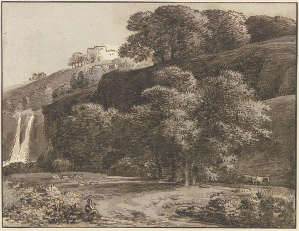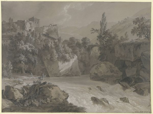Elizabeth Murray’s "River with Castle Ruin and Boat II" is a drawing using graphite on paper, and it presents a landscape dominated by a river, flanked by trees and featuring a ruined castle. The composition’s tonal gradations, ranging from the light sky to the dark foliage, create depth and a sense of atmospheric perspective. Note how Murray employs a limited palette to focus on structure and form. The river acts as a central horizontal axis, mirroring the sky and creating a sense of balance. The ruined castle on the left and the dense trees on the right frame the scene. The artist’s structuralist approach, with its emphasis on binaries like light and dark, ruin and nature, invites a semiotic reading. The castle could symbolize the past, decay, and the sublime, while the boat suggests human presence and the passage of time. Murray’s work invites reflection on the interplay between nature and culture. The drawing's somber tone leaves us contemplating its historical and artistic significance.