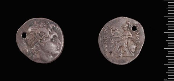Curator: Let's examine this Drachm of Alexander the Great, minted in Lampsakos. Editor: It's so tiny and worn, yet I feel the weight of history just looking at it. Incredible. Curator: Indeed. Coins served not only as currency, but also as potent symbols of power and propaganda. The portrait of Alexander is itself an emblem. Editor: That stern profile, though! It looks almost godlike with that wild hair and the hint of a diadem. Talk about branding. Curator: The image on the reverse, a seated Zeus holding an eagle, reinforces the ruler’s divine connections and legitimacy. Editor: It’s like a snapshot—or rather, a coinsnap—of an era, miniaturized for posterity. A tangible link to Alexander's ambition. Curator: This little coin really encapsulates the visual language of empire. Editor: Absolutely. I will remember that the next time I find some spare change.