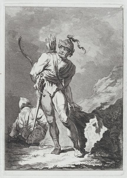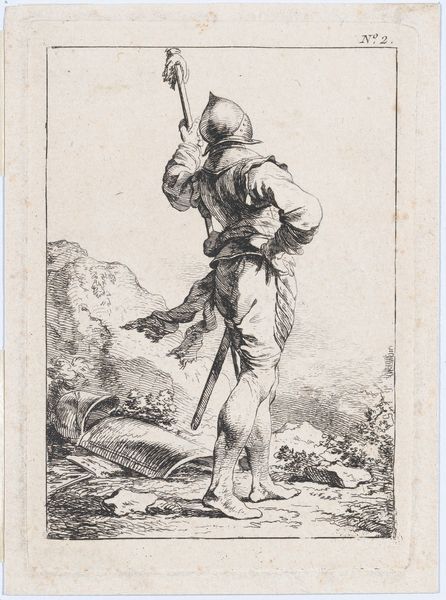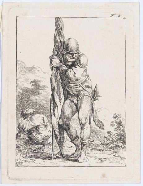 Curator: Here we have "Standing Officer Holding a Lance" created sometime between 1755 and 1771 by Philippe Jacques de Loutherbourg, a compelling engraving. Editor: My first thought is the line work; it’s incredibly detailed but feels almost… playful? There's a vibrancy despite the historical subject. And is he barefoot? Curator: Indeed. It's fascinating how Loutherbourg depicts this officer—certainly an attempt to connect him with the past, invoking perhaps a Roman commander or some other historical military figure, although with those bare feet… Editor: I am also curious about the status and purpose of engravings such as this at this moment in time. Was this aimed at an elite audience of collectors, or was it produced to educate the public, shaping how the military and warfare was percieved? I suppose these would shape public sentiment. Curator: Very astute. Engravings like this had a dual purpose. On one hand, yes, they circulated among collectors interested in historical and military subjects, fueling a fascination with the past. But they also served as visual propaganda, subtly shaping public perceptions of power and military might. It’s interesting that printmaking served to spread Enlightenment ideas about history, even as its subject often depicted aristocratic military leadership. Editor: The detail on the armor versus the looseness of the background, almost as if rendered by different hands, makes me think about labor divisions in the print shop, about how the final object's consistency relies on distinct types of workmanship. Did the studio specialize? How are we to understand printmaking within a capitalist frame? Curator: That is fascinating to think about in regards to the division of labor and its influence on aesthetics! In terms of specialisation: absolutely, large printmaking workshops often had specialists focusing on different elements like figures, landscapes, or ornamental details, adding layers to our appreciation of it as a manufactured item and its historic agency. The Met acquired the work in 1888 which probably added a certain type of distinction at this time. Editor: A fitting purchase date, given the growing appetite of museums for items of this kind during that period. Looking at it now, I think what stands out to me is this print’s reminder of the complex relationship between artistic skill, historical narrative, and the means by which art enters into public consciousness. Curator: For me, thinking about the socio-political and the popular function that such a piece would fulfill in its era makes this unassuming little image particularly powerful.