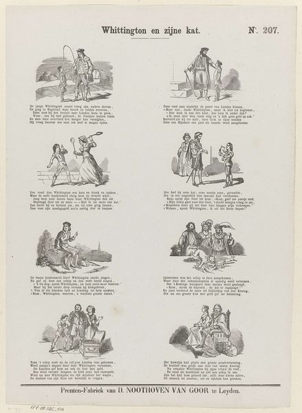 Editor: This is "Jack de reuzendooder," made sometime between 1850 and 1881 by Dirk Noothoven van Goor. It's a print made using engraving with ink on paper, depicting what seems to be scenes from a story. The old engraving style gives it a distinctly historical and almost comical feel. How would you interpret this work, especially within the context of its time? Curator: It is intriguing how this print presents a narrative through a series of vignettes, playing into the popular culture of the time. Consider the intended audience; mass-produced prints like this would have been widely accessible, disseminating stories and cultural values. Is it reinforcing specific social norms or offering a form of light entertainment and social commentary? Think about what the "Jack" character might have represented to the Dutch public in that era. A folk hero? A symbol of national identity perhaps? Editor: That makes sense. I guess I hadn't considered the widespread distribution of images like this and how impactful that would've been. It's not just art for art's sake, but really embedded in how people understood stories and their world. But do you think it had political undertones at all, especially given that it was printed around the mid-19th century? Curator: Political undertones are definitely a possibility. Think about the rise of nationalism during this period and the way folk tales were often used to promote a sense of shared cultural identity. Who is Jack fighting? Giants? Who might they represent on a socio-political scale? Understanding that context can help us to see if there were possible subtle messages within the visuals and narrative being conveyed. Editor: So it’s more than just a children's story; it’s potentially a commentary on the relationship between the Netherlands and other powers, using symbolism embedded within popular narratives. Thanks, that shifts how I see it a lot. I need to consider the potential social influence prints like this might have had back then. Curator: Exactly. By understanding the historical context and the socio-political forces at play, we move closer to deciphering the complex meanings behind what appears at first glance to be mere children's entertainment. Now you start considering your audience in an essay; how does this contextual shift affect your personal analysis and writing style?
