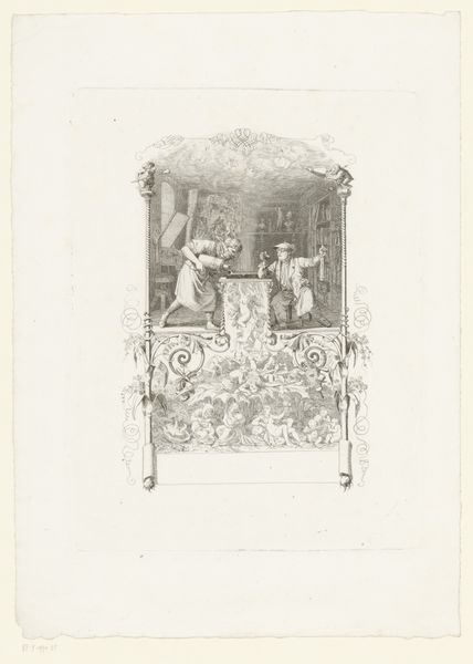 Curator: This is a print titled "Titelprent met portret van Andrea Mantegna en putti," created in 1776 by Giovanni David. It's currently held in the Rijksmuseum. Editor: It's a fascinating piece. My first impression is one of lightness and ethereal quality; the figures, rendered in delicate lines, seem to float across the page. The composition strikes me as quite Baroque, juxtaposed with neoclassical elements in the architecture. Curator: Yes, Giovanni David worked during a time of shifting aesthetic ideals. He clearly draws inspiration from both the Baroque and Neoclassical styles. The image commemorates Andrea Mantegna, but it does so within the visual language of the late 18th century, a period when printmaking served significant cultural and political purposes. Prints such as these served to disseminate artistic ideas and promote particular cultural heroes. Editor: The lines are delicate, almost like whispers on paper, guiding the eye through vignettes that feel allegorical in nature, with the cherubic putti that animate the scene. There is clearly a hierarchy within the composition, which guides my understanding. How did the intended audience perceive the composition? Curator: Well, such a print had a distinct function. This image probably functioned as a frontispiece, acting as a visual preface, bestowing prestige and authority to the work. We must remember the social context of printmaking—this engraving could reach a wider audience, shaping public perception of artists like Mantegna and associating them with Neoclassical values and enlightenment ideals. Editor: Looking closer, the contrast between the architectural precision on the left and the organic fluidity of the figures creates an interesting tension. Note how the use of empty space is a dynamic compositional tool for directing visual motion within the image. It strikes me that David used light to separate planes and further enhance focal points. Curator: Exactly, Giovanni David was employing visual tools to convey cultural meaning. He presented art as something sanctioned by both classical tradition and the Enlightenment present. Editor: It really makes you appreciate the complexity and intention embedded within even a seemingly simple print. I will walk away now looking for contrasts, light, and negative space in artwork. Curator: Agreed; looking at it from this perspective reveals how deeply ingrained societal values are within even seemingly decorative pieces like this one.