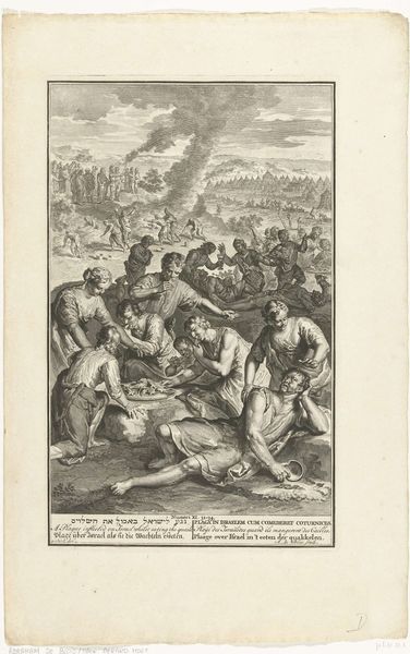 This engraving, "Dans rond het gouden kalf" by Jan van Vianen, likely from the late 17th or early 18th century, presents us with a scene of dynamic chaos and idolatry. The composition is divided into distinct spatial registers. In the foreground, we see figures reveling in earthly pleasures, while the mid-ground depicts a frenzied dance around the golden calf itself. Van Vianen employs a masterful use of line to differentiate textures and forms. Notice the contrast between the smooth, flowing lines that define the human figures and the sharp, jagged lines used to depict the fire and the tumultuous sky. This dichotomy serves to highlight the tension between the earthly and the divine. The human figures at the bottom of the scene become a semiotic register as they use their hands to touch each other, the calf, and the food. What strikes me most is how Van Vianen uses the stark contrast of light and shadow to create depth and drama, drawing our eye into the heart of the scene. The formal arrangement challenges the viewer to consider the consequences of forsaking spiritual principles for immediate gratification.
